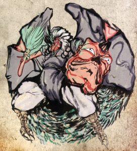 Nuestro preferido sin duda, el señor naricitas. Bueno, mejor no llamarlo así, no vaya a poseernos. Bromas aparte, el Daitengu (大天狗) o gran tengu, es el que se suele reconocer en occidente y tiene rasgos humanos. Además, es el único que tiene los poderes de controlar el viento, y se le suele representar con un abanico. Como mencionamos anteriormente, es venerado como una divinidad en multitud de templos. Cuando se encuentra con alguien, intentan atormentarlo o tratar de engañarle, aunque en muchas ocasiones se dedican a mostrarles su magia, o incluso a enseñarles y guiarles. Es por eso que muchos se han aventurado en su busca, ya sea para conseguir conocimiento o poder.